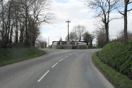 Very shortly after leaving the town, at just  0.4km, you will see a large cross forming a junction [above]. Take the left fork here. This is the D206 but it is not  marked as such. It is quite a twisty road. At 1.2km you will go down a hill  through a tiny hamlet, and see a pink house on your right.
