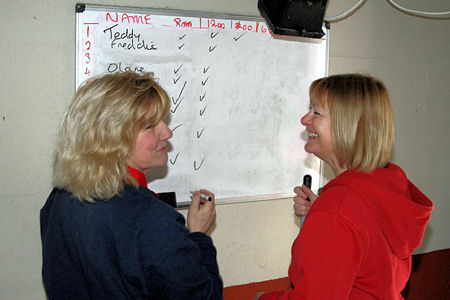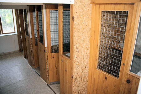 There are eleven kennels in the purpose built kennel block (another, similar block will be built next winter to satisfy demand). All kennels are divided into two parts. There is an inside area with bedding and, when it’s chilly, heating. There is also a covered outside exercise run. Both sections are protected by a further perimeter.