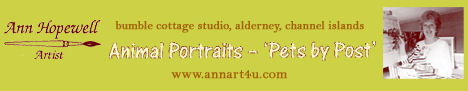 Based on the lovely Channel Island of Alderney just off the Normandie coast, Ann Hopewell has been painting with a variety of materials for many years, as well as teaching art to others. One of her specialist areas is her “Pets by Post” service - www.annart4u.com